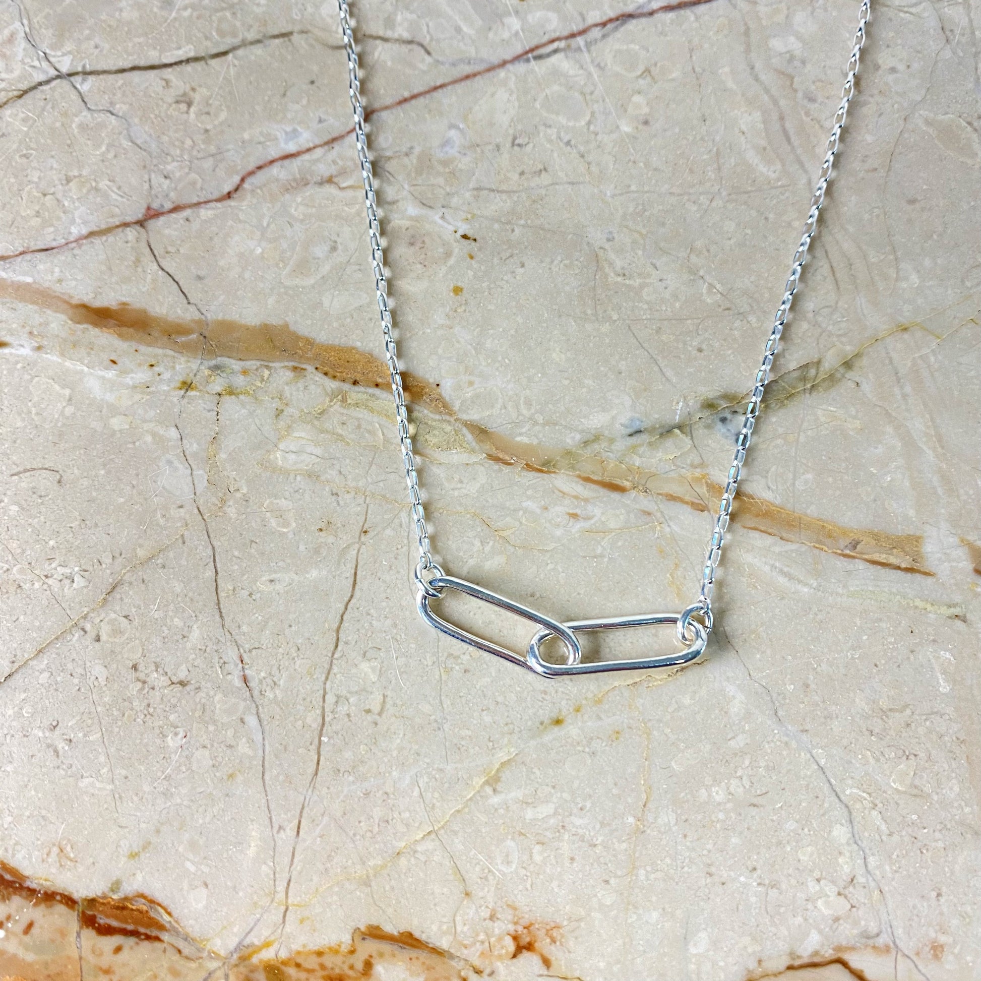 We love a good connection and this one holds on tight. This duo of high polished 1.5mm round wire oblong cable links are fastened to a drawn sterling silver cable chain. Our little nod to the trendy paperclip chain.